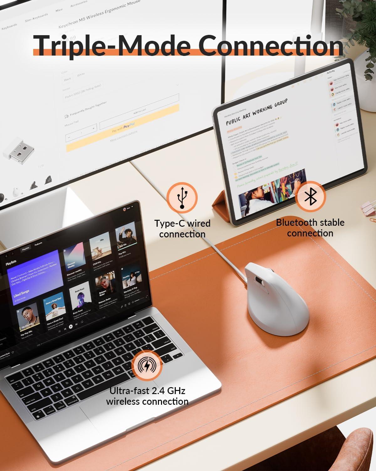 • Keychron M5 8K Vertical Ergonomic Mouse Wireless, 2.4 GHz/Bluetooth 5.3/Wired Computer Mice Rechargeable, 5 Levels Up to 30K DPI with Programmable Buttons for Laptop macOS/Windows – White(White)
