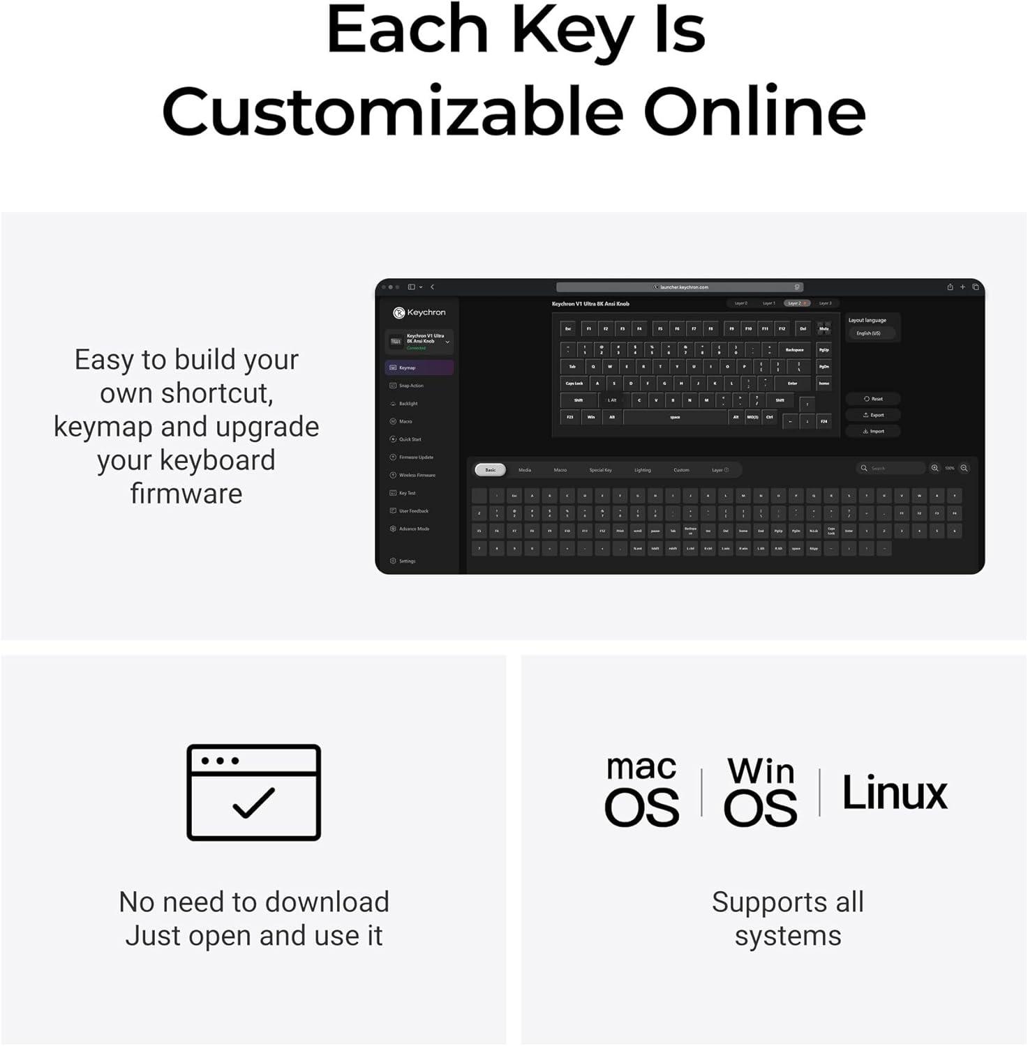 • Keychron V1 Ultra 8K Wireless 2.4 GHz & Bluetooth Custom Mechanical Keyboard Launcher Web App with Hot-swappable Keychron Silk POM Red Switches PBT Keycaps for Mac Windows Linux(Hot-swap Keychron Silk POM Brown Switch)