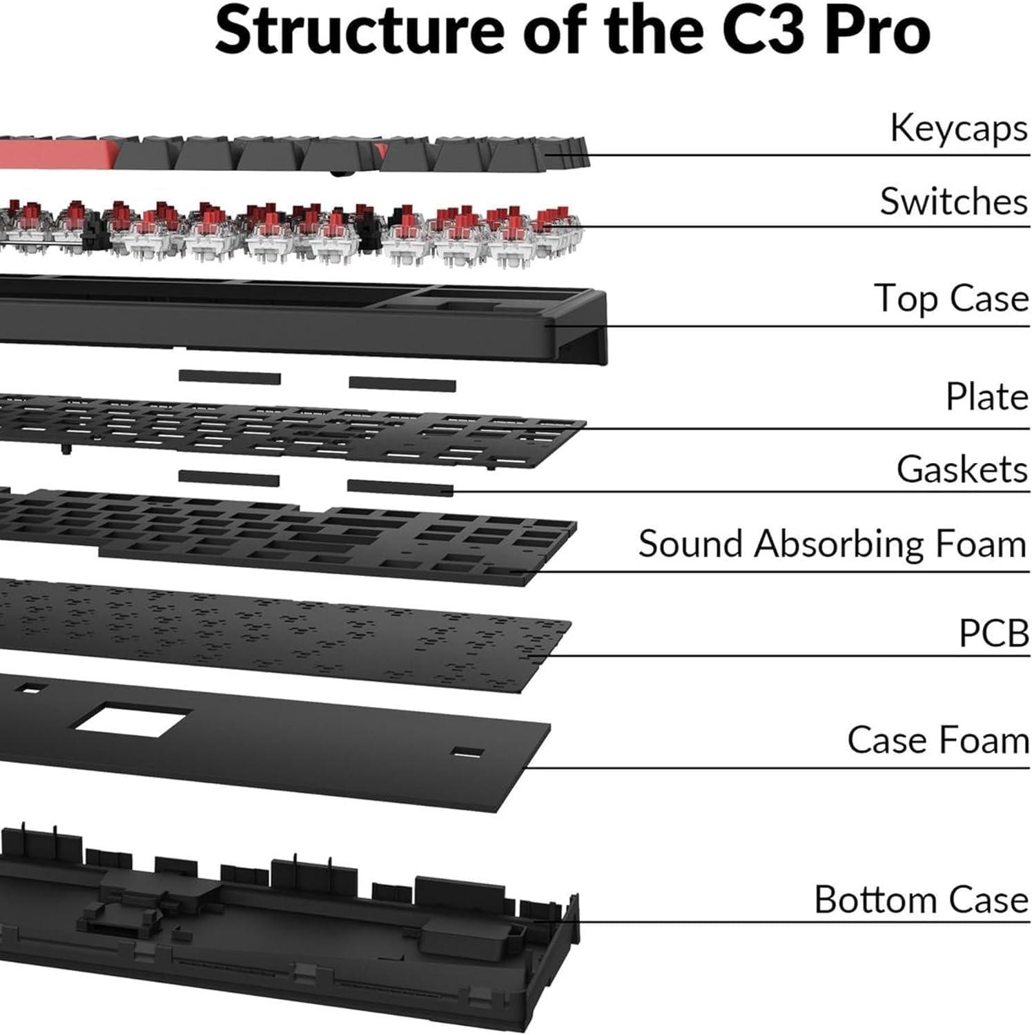 Gasket mount design: The C3 Pro 8000 Hz polling rate version uses a gasket mount structure to reduce sound resonance while adding more typing flexibility. Along with the sound-absorbing foam and the case foam, it provides you with a quieter and smoother typing experience.