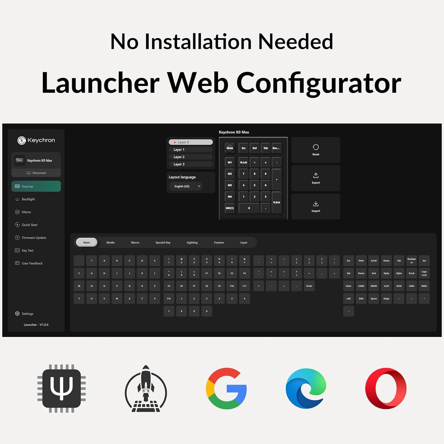 Launcher Web Configurator: Powered by open-source QMK firmware, the K0 Max offers endless customization. Remap keys, set macros, and define shortcuts via the Keychron Launcher web app—no downloads required. Configure your numpad online anywhere with ease and total flexibility.