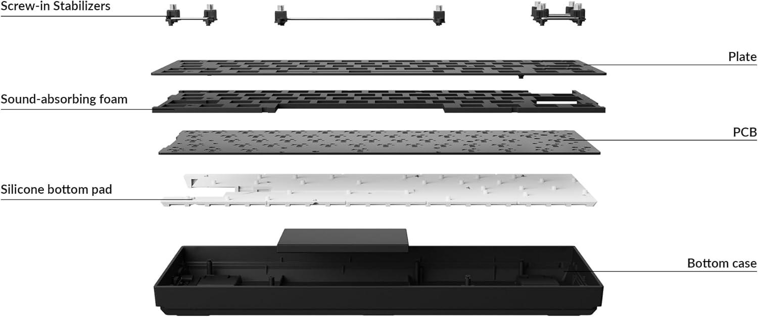 Upgraded Typing Experience: Redesigned from the inside out with screw-In PCB stabilizers on “big keys”, added sound-absorbing foam, a thick silicone dampening bottom pad, and steel plate provide responsive feedback and a peaceful sound. *Other plate materials are available to buy separately. A+