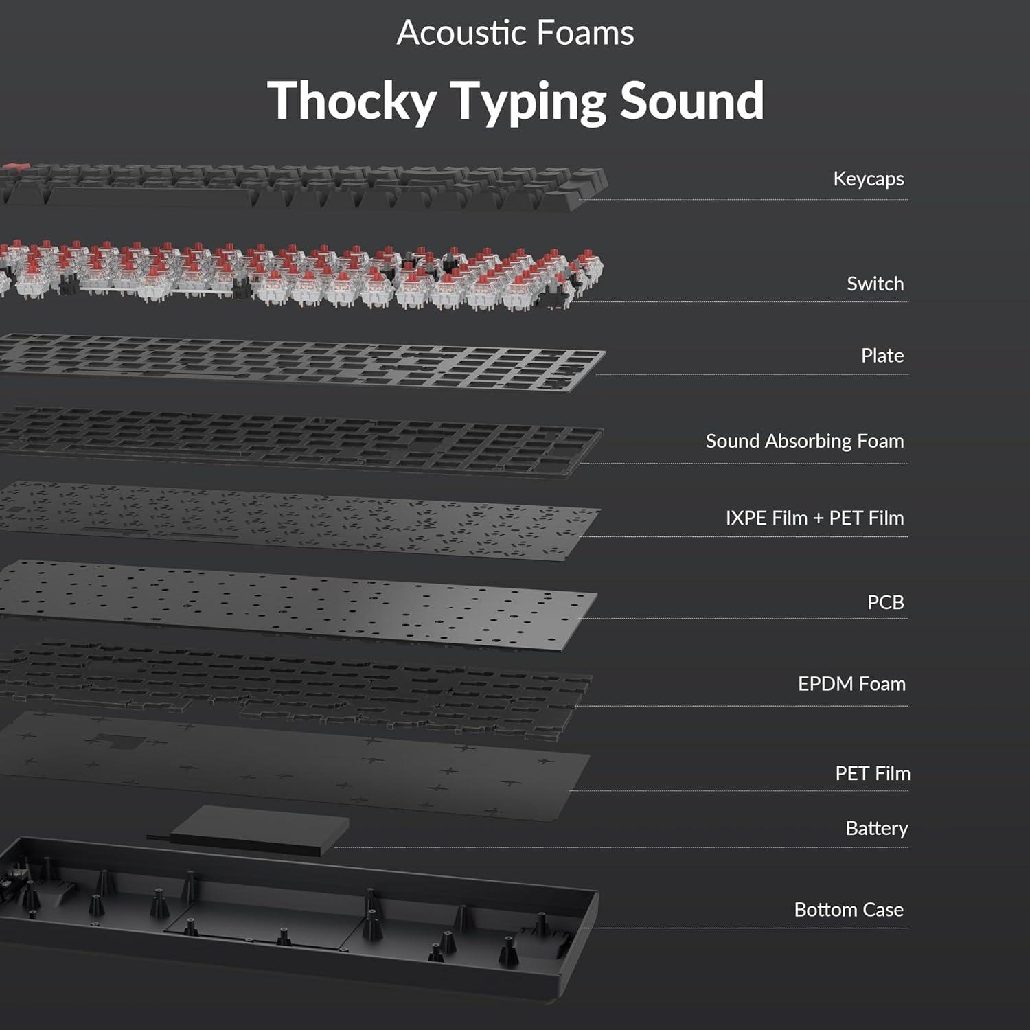 The K4 can last up to 240 hours (with backlit disabled) with a 4000 mAh big battery, which is one of the biggest in mechanical keyboards. N-key rollover (NKRO) on wired mode or 6KRO on wireless mode.