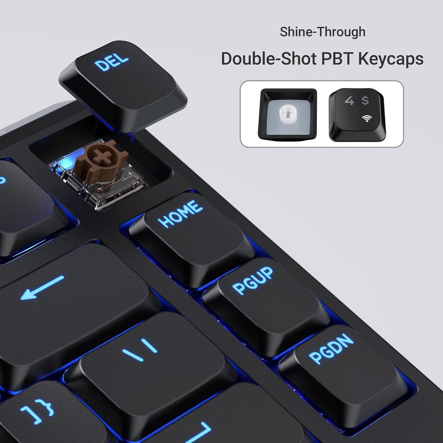 Doubleshot Low Profile PBT Shine-Through Keycaps & Per-Key RGB: With a 1.3 mm actuation—about 35% faster than standard switches—it offers smooth, precise travel and lasts up to 50 million keypresses. Comes with more than 22 types of RGB backlight settings (as well as a static white backlight option). The J1 features Per-Key RGB and Mix RGB, letting you customize the color of each key individually with full control.