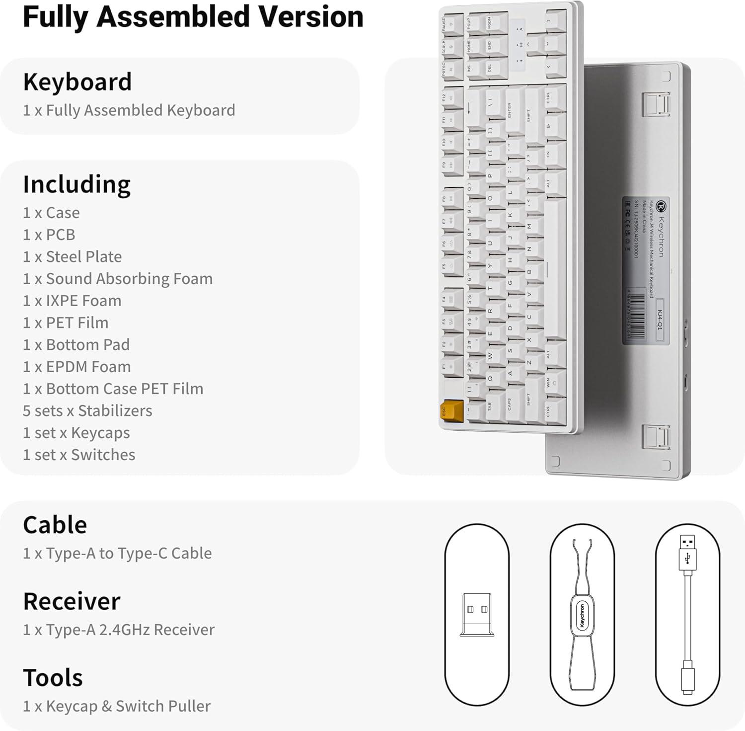 Keychron KJ4 Wireless Custom Mechanical Keyboard, 2.4 GHz Bluetooth QMK 80% Layout RGB, Hot-swappable Banana Switch Compatible with Mac Windows Linux, 3750mAh Fast Charge Battery for Gaming – Black(White – Red Switch)