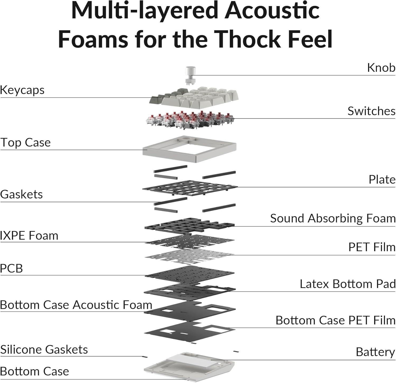 Enhanced Thock Feel – Added a combination of premium acoustic foams such as IXPE, PET, and Latex. Together with our double-gasket design, screw-in stabilizers, and more. Each keystroke has become more enjoyable.