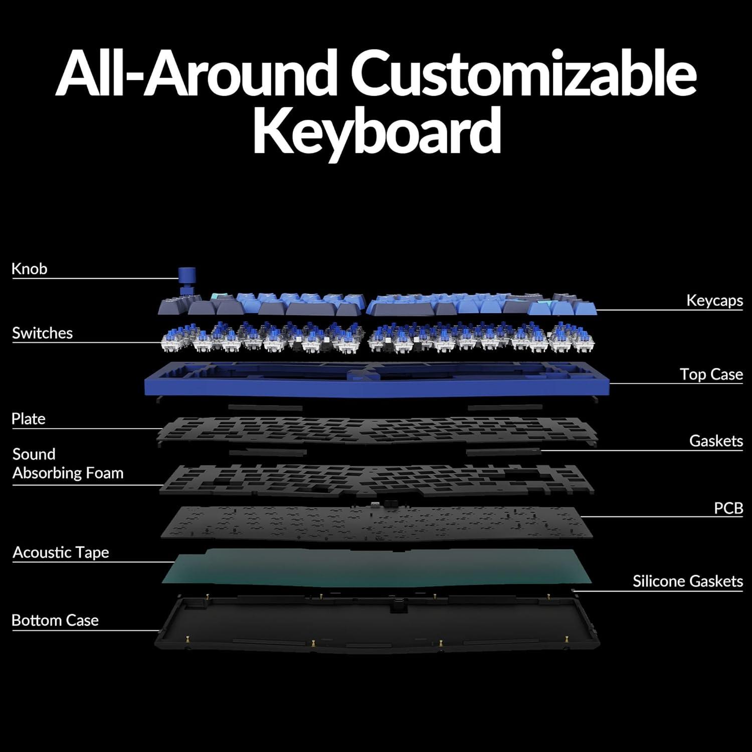 Double Gasket Design: An innovative structure adds silicone pads between the upper and lower housings to minimize sound resonance and reduce noise from metal impacts. This design maintains the board’s flexibility while significantly improving acoustics for a more satisfying typing experience.