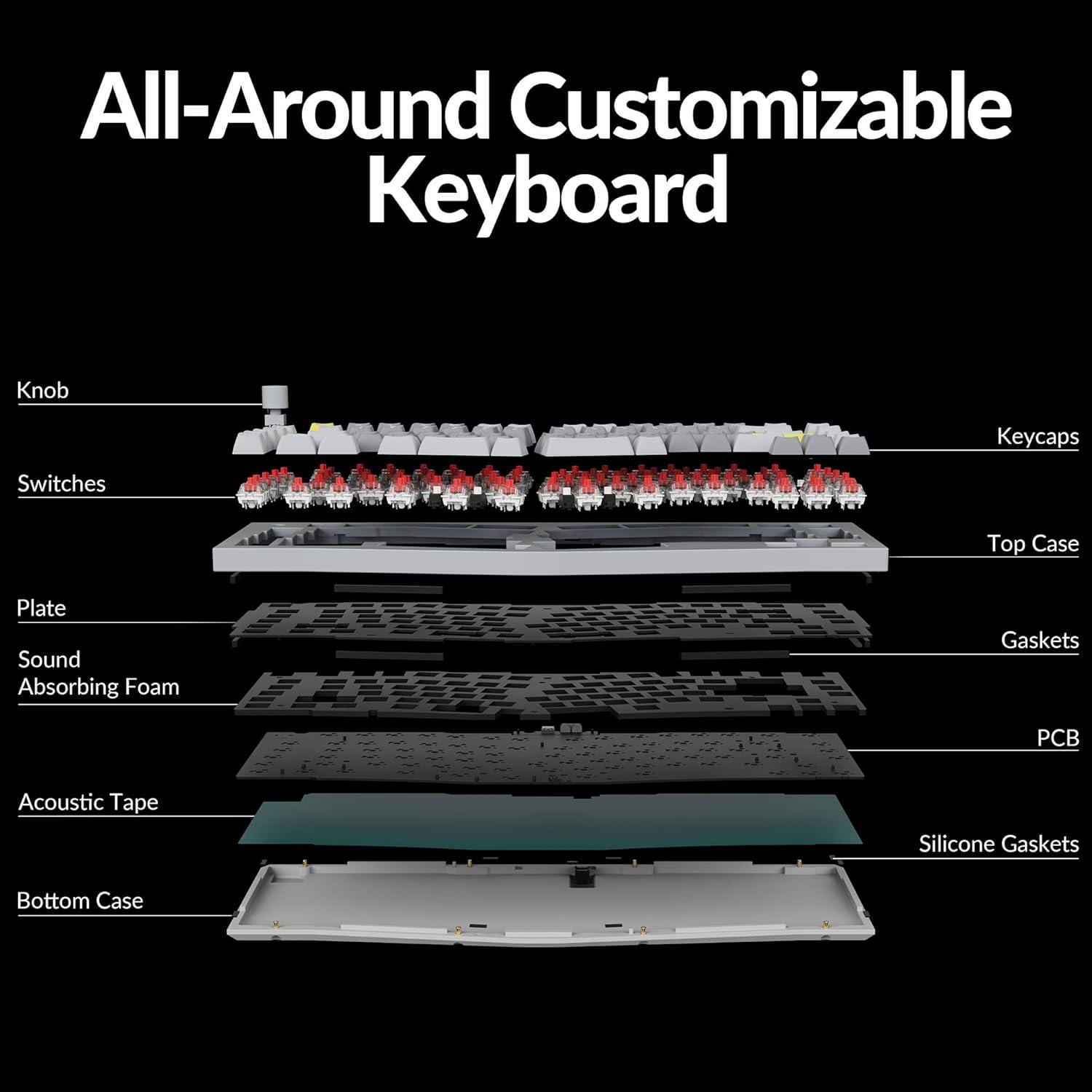 Double Gasket Design: An innovative structure adds silicone pads between the upper and lower housings to minimize sound resonance and reduce noise from metal impacts. This design maintains the board’s flexibility while significantly improving acoustics for a more satisfying typing experience.