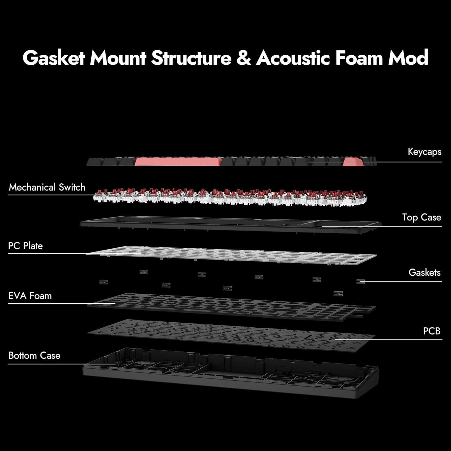 Gasket-Mounted & Acoustic Foam Mod – Reducing vibrations and noise. The EVA acoustic foam and PC plate further dampens keystroke noise to ensure a quieter, smoother, and more comfortable typing experience.